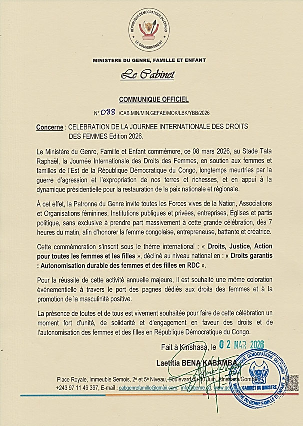 Le communiqué souligne que «la présence de toutes et de tous est vivement souhaitée afin de faire de cette journée un symbole d’unité, de solidarité et d’engagement pour la promotion des droits et de l’autonomisation des femmes et des filles en RDC».