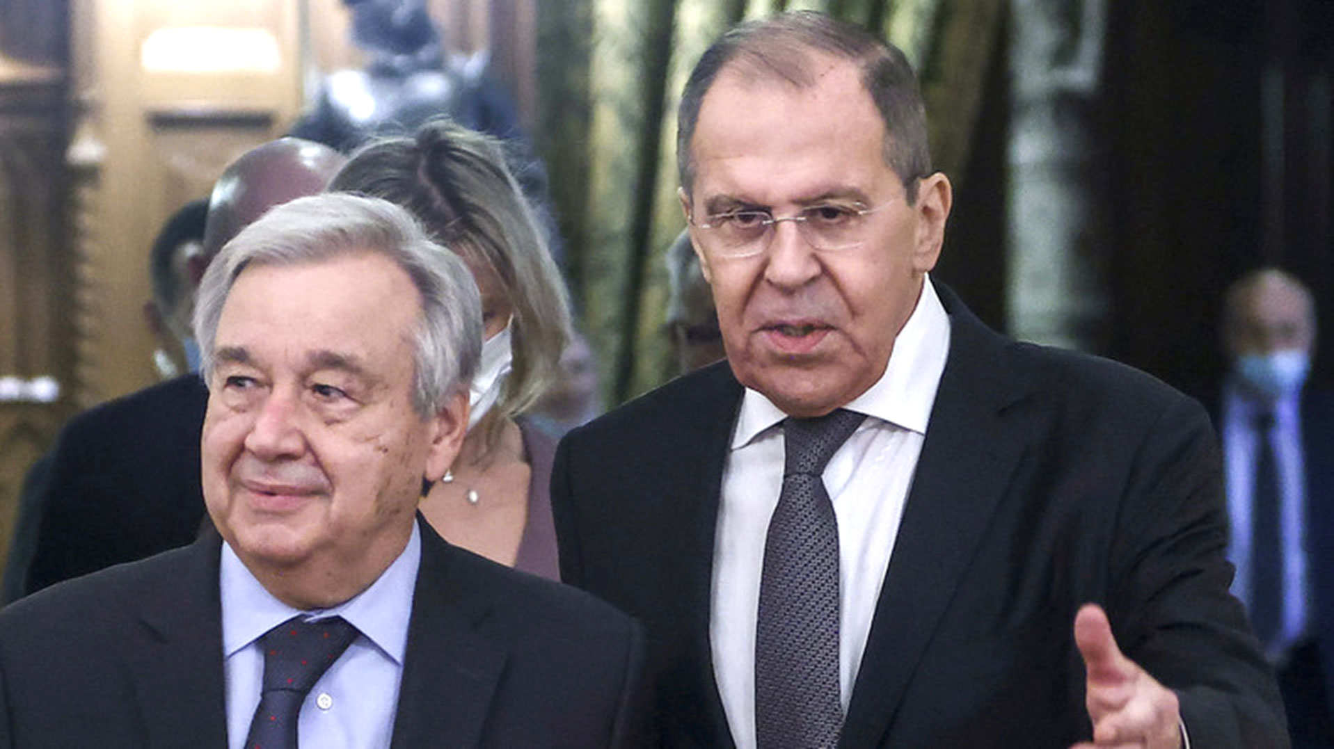 Sergueï Lavrov, le ministre russe des Affaires étrangères a remercié en préambule de la conférence de presse la présence d’Antonio Guterres et à sa « volonté d’examiner l’ensemble de cette situation [en Ukraine], pas de façon isolée mais comme une accumulation des faits« . Il a également rappelé le processus de la Charte des Nations Unies que la Russie dit avoir respecté en faisant appel à Antonio Guterres. « Cela s’est passé en résultat de l’a priori des décisions prises par nos collègues américains visant à établir un monde unipolaire« , a ajouté Sergueï Lavrov.