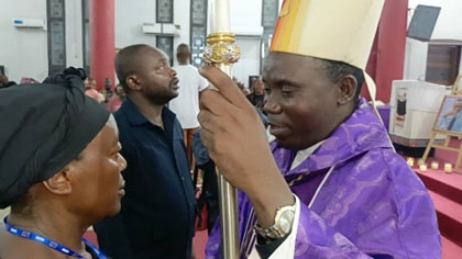 S’adressant à la veuve Marie-Josée Nzoloko, le Prélat l’a exhorté «à devenir une femme de la foi, de la consolation... Une femme forte qui porte le flambeau de la foi, capable de relever les défis et de continuer la lutte et le travail de son mari».