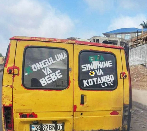 Que dire de ''sinonime'' que notre source a écrit dans le message derrière le véhicule ? Est-ce la forme en lingala de ''synonyme'' ou est-ce l'orthographe française telle que l'auteur la comprend ? Dans tous les cas, le ''sinonime'' de l'auteur anonyme s'écrit ''synonyme'' en français.