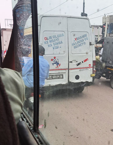 " Awa na ring oyo ngayi nde champion. Olie oloba ke ngayi na simbi kisi, yaka nde nalakisa yo secret !!!". Ce message que nous venons d'apercevoir sur trois endroits : le côté gauche et le double battant de la portière arrière d'une Mercedes-Benz Sprinter 212, signifie en français ''Ici sur ce ring, c'est moi le champion. Au lieu de dire que je viens de toucher aux fétiches, viens que je te montre le secret !!!''