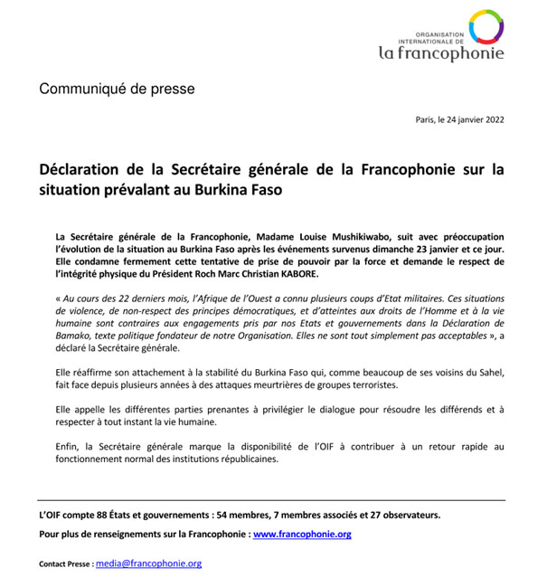 Burkinafaso:l’OIF et l’UA condamnent la tentative de prise de pouvoir par la force