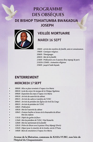 Les familles Buakadwa, Tshiatumba et Dinyika annoncent avec profond regret à la communauté Bajila Kasanga, chefferie de Kamuena Nsapu, village Bakua Tshilomba kena Kalamba, basée à Kinshasa, ainsi qu'aux amis, connaissances et à la communauté chrétienne, le programme des obsèques de leur fils, frère, père et oncle :
