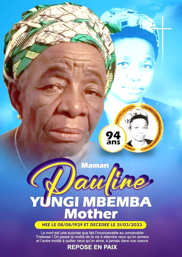 Les Familles Cyrille MILANDOU, MEBOYA et Barnabé MBEMBA BIYEKULA ont la profonde douleur d’annoncer aux amis et connaissances le décès de leur tante maternelle, mère, belle-mère, grand-mère, arrière-grand-mère et tante, Maman Pauline Yungi Mbemba. Décès survenu à Kinshasa, le 21 mars 2023.