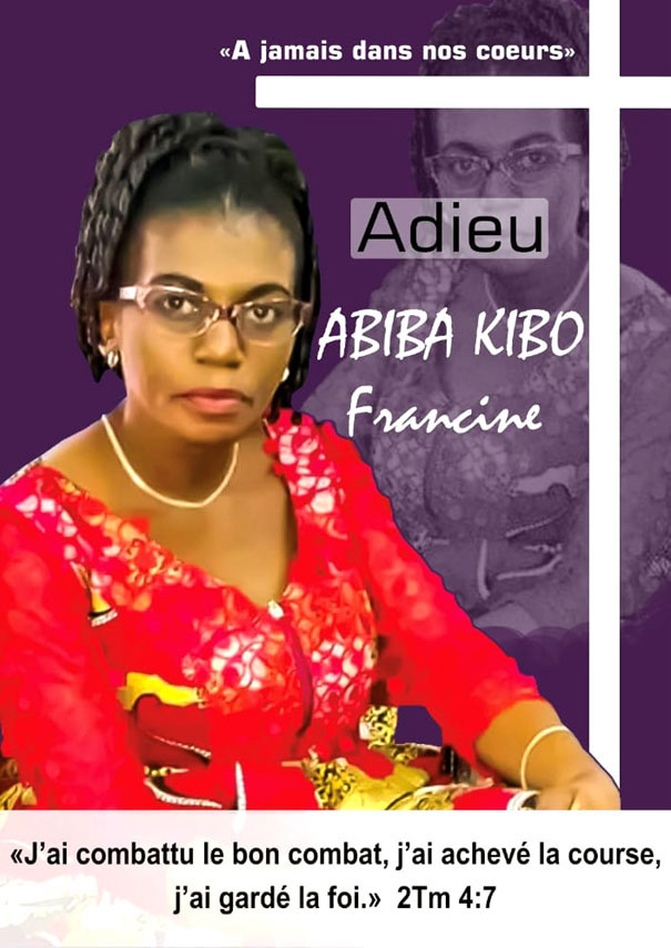 Monsieur Jean-Luc MUSHIMPAKO, Chef de Division à la Direction de la RTEDUC du Ministère de l’EPST et Assistant parlementaire de l’honorable Marie-Ange Lukiana, et les familles MUSHIMPAKO, KIBO et MILEBWE ont la profonde douleur d’annoncer aux parents, amis, collègues et connaissances, le décès de leur épouse, fille, belle-fille, nièce et cousine, Mme Francine ABIBA KIBO, cadre à la sous-direction des Relations publiques et Hôtesse à la Direction Générale de la Société Commerciale des Transports et des Ports, SCTP (ex-ONATRA).