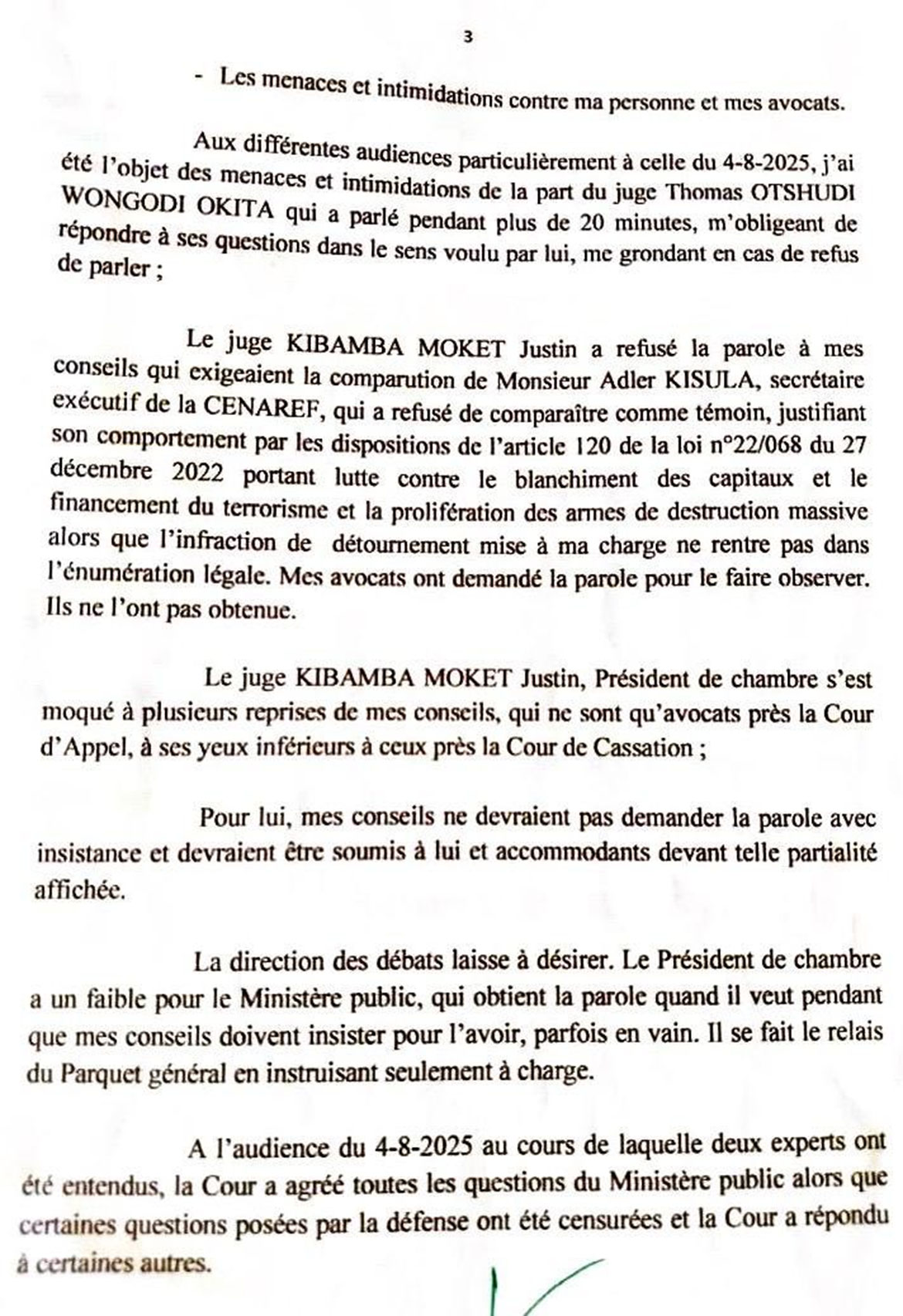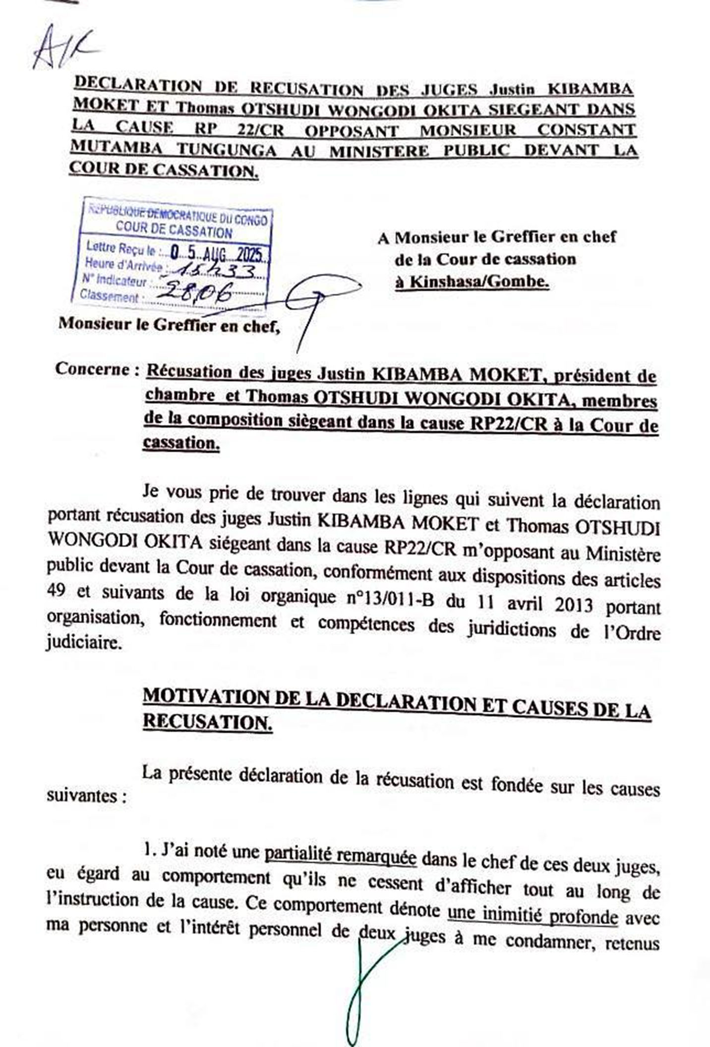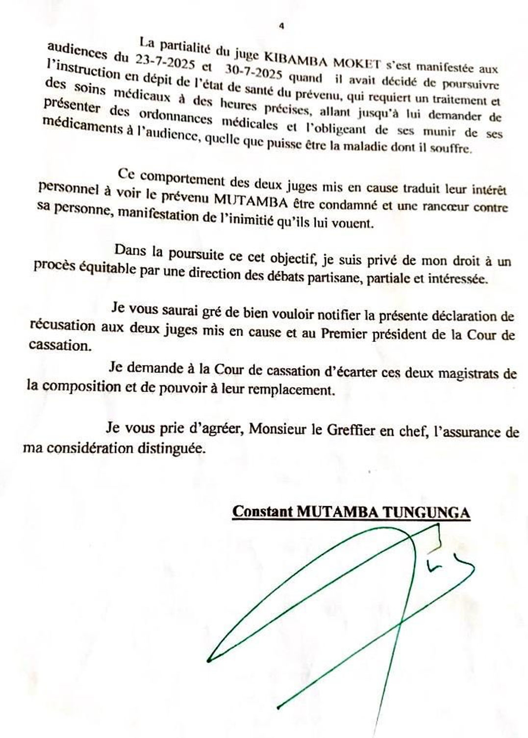 Lire en page 3 la correspondance de C. Mutamba au greffier en chef de la Cour de cassation.
