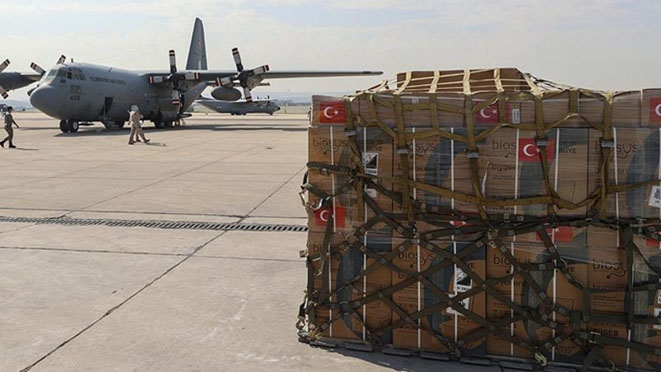 Le matériel composé de kits de détection et de vaccins contre le Covid-19, d’appareils respiratoires, de masques, de désinfectant et de gants stériles a été préparé sous la coordination du ministère de la Santé et du ministère de la Défense nationale sur les instructions du président de la République, Recep Tayyip Erdogan.