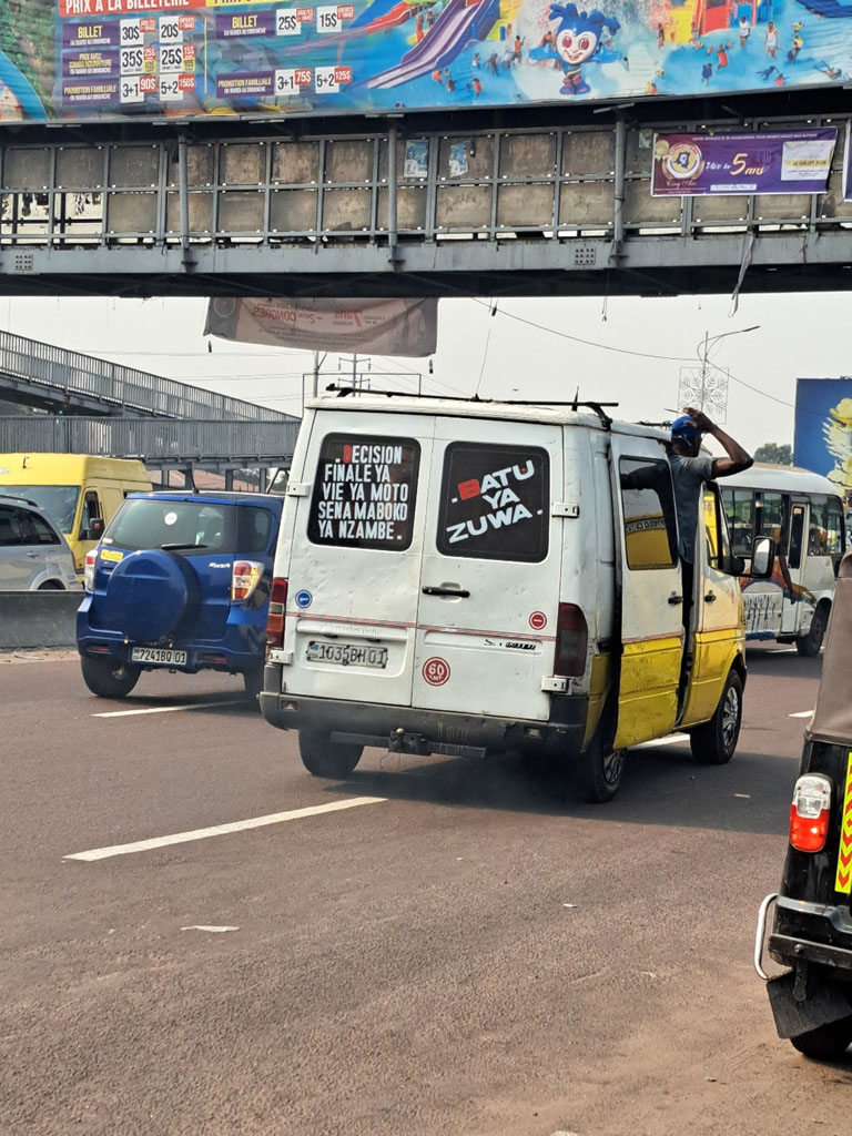 « Décision finale ya vie ya moto sena maboko ya Nzambe. Batu ya zuwa « . (La décision finale pour la vie d’une personne c’est entre les mains de Dieu. Les jaloux), dit en français ce message en lingala livré par nos amis du secteur des transports en commun.