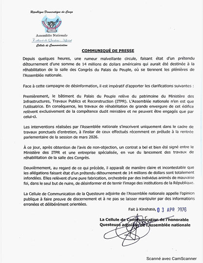 Face à l’emballement d’une rumeur persistante évoquant un supposé détournement de 14 millions de dollars destinés à la réhabilitation du Palais du Peuple, la Cellule de communication de la Questeure adjointe de l’Assemblée nationale sort de sa réserve et oppose un démenti sans équivoque.