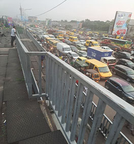 Une fois de plus, la déception est totale : pas assez de véhicules en vue, sinon une autre foule immense en attente désespérée d'un moyen de déplacement, et. quelques motos stationnées, alors que d'autres, chargées, filent à vive allure, Un bus Transco stationné est envahi par une nuée de personnes. Son intérieur est fort suffocant. Je préfère garder le peu souffle qui me reste qu d'aller suffoquer dans ce bus archiplein ! Mais à la différence que la voie est maintena,t libre sans véhiciles