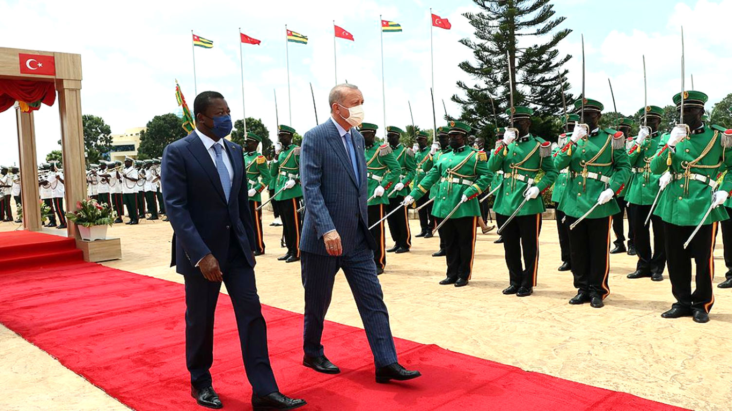 Le président de la République turque Recep Tayyip Erdogan a été accueilli par son homologue togolais Faure Essozimma Gnassingbé lors d’une cérémonie officielle au palais présidentiel à Lomé, capitale du Togo, deuxième arrêt de sa tournée en Afrique.