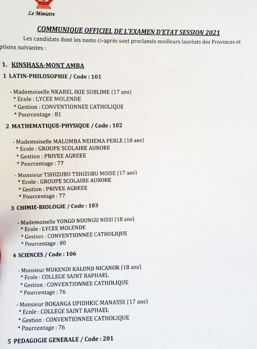 Le ministère de l’Enseignement primaire, secondaire et technique (EPST) a rendu public via un communiqué, hier lundi 11 octobre les noms des lauréats de l’Examen d’État ( Exetat) édition 2021 pour la province éducationnelle de Kinshasa. Les résultats d’heureux diplômés seront connus ce mardi 12 octobre après pratiquement 40 jours d’attente. Siméon Yenge Kome de l’ITI Masina (Tshangu), âgé de 18 ans et Sublime Nkabel Ikie du Lycée Molende (Mont-Amba), âgé de 17 ans ont obtenu 81 pourcent. Lukunga attend encore ses lauréats.