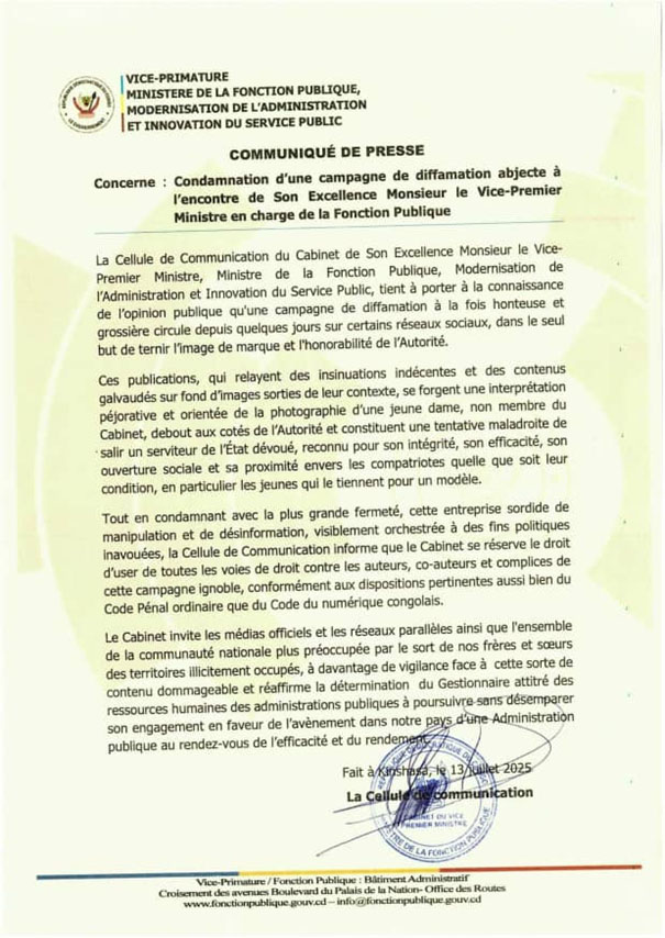 Dans un communiqué rendu public, la Cellule de Communication du Cabinet du Vice-Premier ministre en charge de la Fonction Publique a vigoureusement dénoncé une campagne de diffamation visant à ternir l'image et l'honorabilité de son autorité.