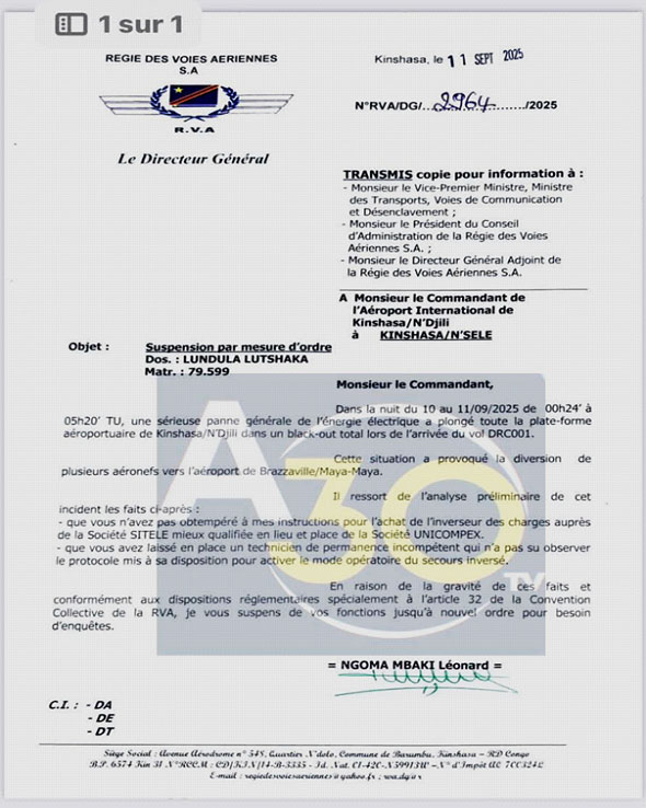 Lorsque Léonard Ngoma écrit dans sa correspondance que le commandant de l'aéroport international de Ndjili est suspendu pour besoin d'enquêtes, la question qu'on lui pose est : Pourquoi ne pas respecter la procédure administrative pour lui permettre de donner sa version de faits en rapport à l'événement. Suspension pour besoin d'enquête apparaît trop ambiguë, soutient-on.