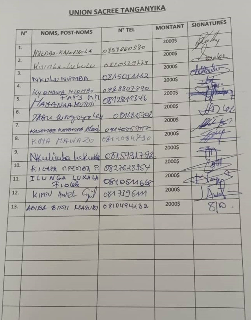 D’après un document confidentiel partagé par la sénatrice Francine Muyumba, les 13 députés sur 25 qui ont voté pour la déchéance du frère cadet de Joseph Kabila ont perçu chacun 2.000 USD de la part des hauts cadres de l’Union sacrée au Tanganyika.
