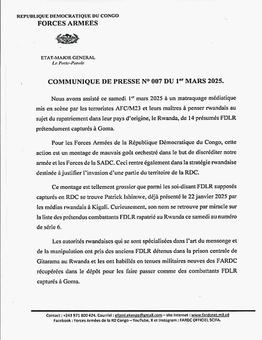Les Forces armées de la République démocratique du Congo (FARDC) ont réagi avec véhémence au syjet d'une opération de rapatriement de présumés combattants des Forces démocratiques de libération du Rwanda (FDLR), menée le samedi 1er mars par le Rwanda et les rebelles du M23/AFC.