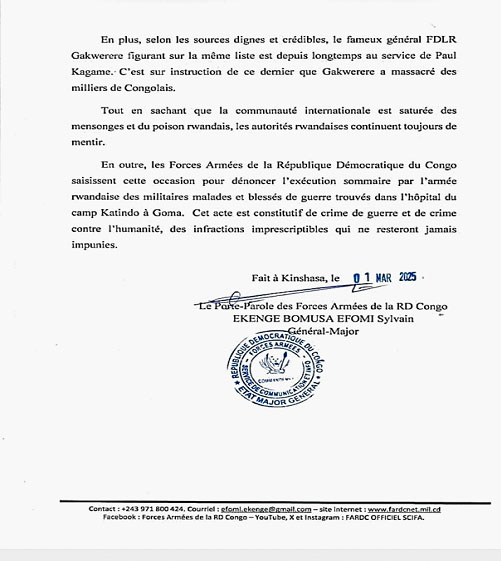 " Curieusement, son nom réapparaît par miracle sur la liste des prétendus combattants FDLR rapatriés au Rwanda le samedi, au numéro de série 6 ", souligne le communiqué.