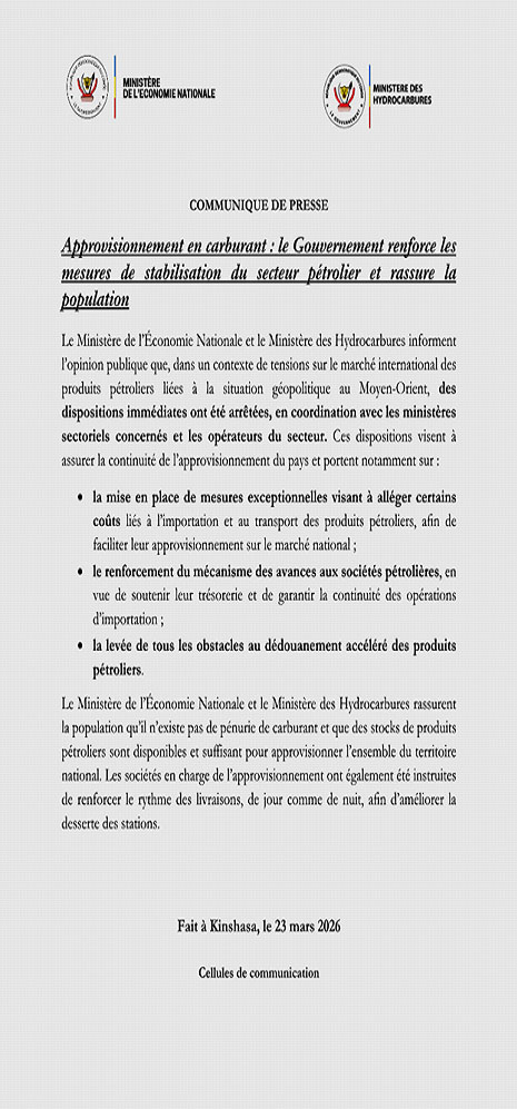 En parallèle, des mesures dérogatoires sont présentées comme nécessaires pour anticiper les conséquences de la tension géopolitique au Moyen-Orient et protéger le pouvoir d'achat. À ce sujet, la Première ministre Judith Suminwa Tuluka a instruit les membres du gouvernement concernés de prendre toutes dispositions afin de suspendre, pendant une durée de 45 jours, le principe de plafonnement du différentiel de transport.