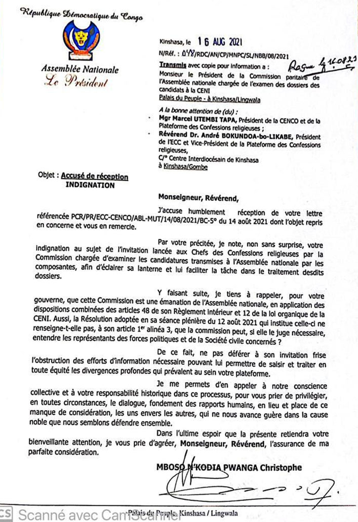Cependant, tout en prenant acte de l’indignation de la CENCO et de l’ECC, le speaker de la Chambre rappelle aux deux confessions religieuses que la commission mise en cause est une émanation de l’Assemblée nationale, en application des dispositions combinées des articles 48 de son Règlement intérieur et 12 de la loi organique de la CENI. Ainsi Mboso considère que le fait, pour les deux confessions religieuses, de ne pas répondre à l’invitation de la commission paritaire, frise une manœuvre tendant à retarder, à empêcher ladite commission de poursuivre son travail. Ainsi, dans sa correspondance d’hier lundi 16 août, adressée au Président de la CENCO et au président de l’ECC, en réponse à leur lettre du 14 août, Christophe Mboso invite-t-il ces deniers privilégier le dialogue, en lieu et place de toute posture voilant le manque de considération. G.K.