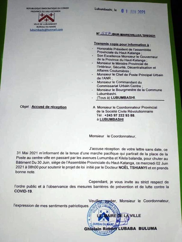 Une lettre d’information adressée au maire de la ville de Lubumbashi fait état de l’organisation, par la Société civile révolutionnaire, d’une marche de soutien à l’initiative de Noël Tshiani ce mercredi 2 juin à Lubumbashi. Cette initiative de loi verrouille l’accès à l’institution Président de la République à tous ceux qui ne sont pas nés de père et de mère congolais. Ci-dessous l’accusé de réception du maire de Lubumbashi.