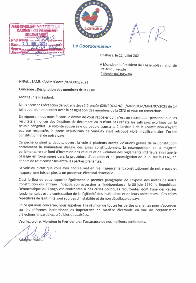Dans une correspondance datée 23 juillet, adressée au Speaker de l’Assemblée nationale, le Coordonnateur de la plateforme LAMUKA, appelle à la réunion de toutes les parties prenantes pour s’accorder sur les réformes institutionnelles impératives en matière matière électorale en de l’organisation d’élections crédibles et appaisées.