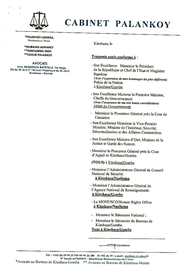 Médard Palankoy a été arrêté manu militari dans son cabinet d’avocat par les services du Conseil national de cyberdéfense le 14 mars. Alors qu’il s’est rendu pour se renseigner sur la situation de son confrère, Maître Gratien Mayila s’est vu, lui aussi, arrêter. Les familles de ces deux avocats s’inquiètent sur leur santé, et n’ont depuis, aucune nouvelle les concernant. «Nous nous demandons s’ils sont en vie ou ont été tués ; car aucune information ne nous est donnée à leur sujet», écrit son épouse, Me Charlotte Mubangi, à l’Administrateur principal du CNC. Voir le fac-similé ci-dessous.