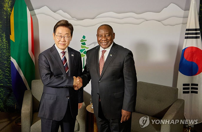 CALGARY/SEOUL, 17 juin (Yonhap) — Le président Lee Jae-myung et son homologue sud-africain Cyril Ramaphosa se sont entretenus lundi en marge du sommet du G7 qui se tient actuellement au Canada. Ils ont évoqué ensemble des pistes pour développer davantage la coopération entre leurs pays.