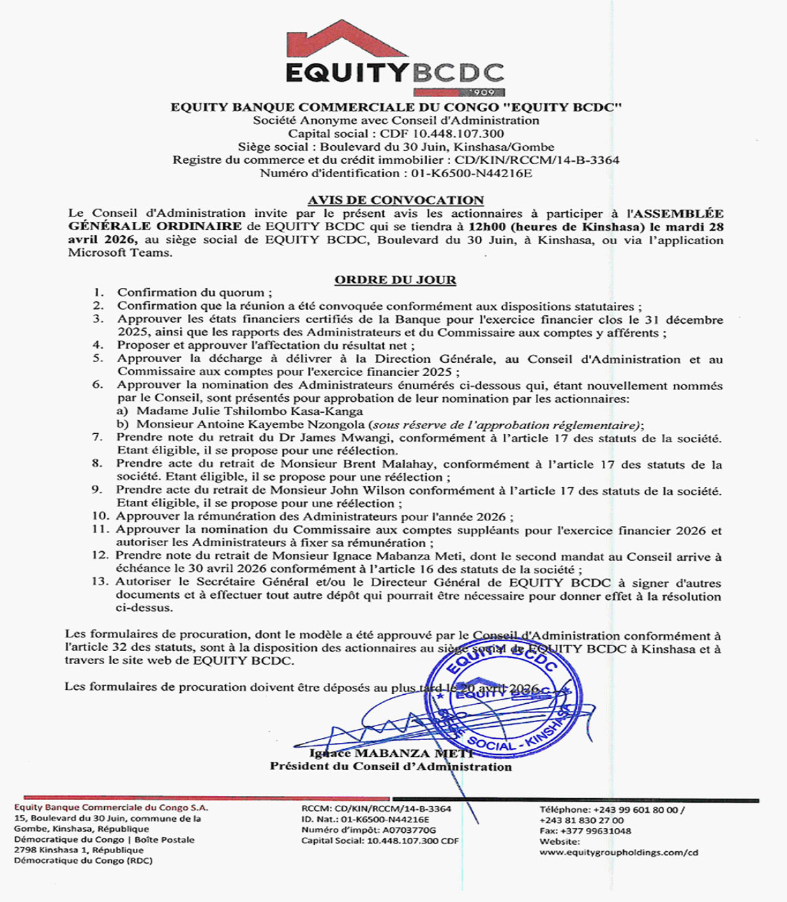 Equity BCDC: convocation des actionnaires à l'Assemblée générale ordinaire le 28 avril à Kinshasa