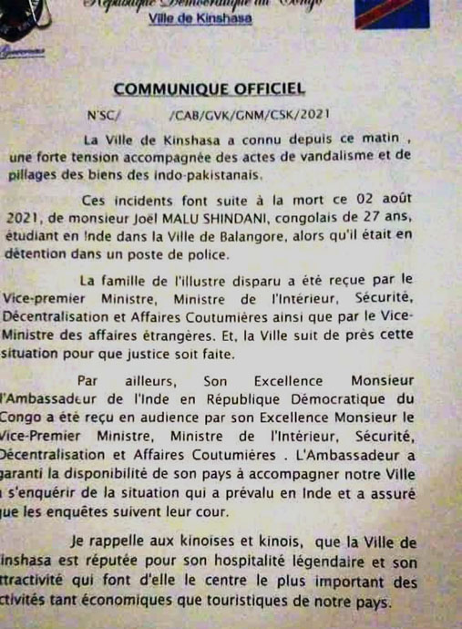 Dans un communiqué rendu publique hier, jeudi 5 août, le gouverneur de la ville de Kinshasa, Gentiny Ngobila, condamne les actes de vandalisme et de pillages commis par certains Kinois contre des biens (supermarchés), appartenant aux Indo-pakistanais suite à la mort « suspecte » de Joël Shindani, étudiant Congolais en Inde. » Cette circonstance ne peut justifier des actes de vandalisme contre ceux qui ont choisi notre ville comme leur lieu d’affaires et de résidence. Je condamne fermement ces actes de vandalisme. La ville ne ménagera aucun effort pour appréhender et poursuivre les auteurs » a martelé le gouverneur. Tout en appelant les Kinois au calme, Gentiny Ngobila a invité les expatriés à exercer librement leurs activités.