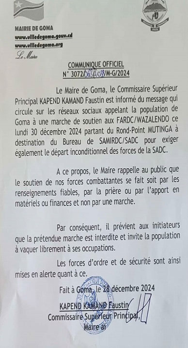 Dans un communiqué, le maire de Goma, Kapend Kamand Faustin, a annoncé l'interdiction d'une marche pacifique prévue ce lundi 30 décembre. Cette manifestation avait pour objectif de soutenir les Forces armées de la République démocratique du Congo (FARDC) et les Wazalendo dans leur lutte contre la rébellion du M23, tout en appelant au retrait de la force de la SADC, jugée "inefficace" dans la traque des rebelles.