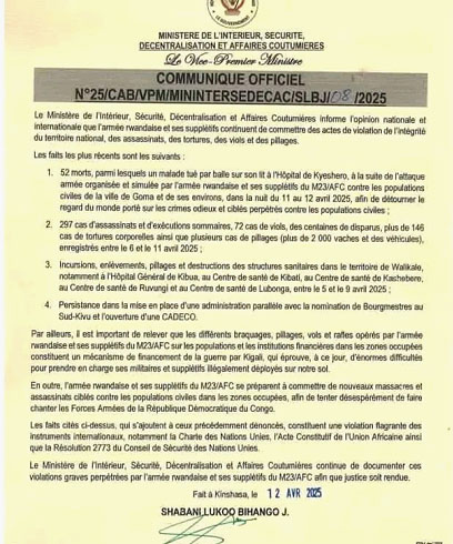 Le ministère de l'Intérieur, de la Sécurité, de la Décentralisation et des Affaires Coutumières de la République Démocratique du Congo dénonce une série d'atrocités commises par l'armée rwandaise et ses supplétifs du M23/AFC. Dans un communiqué signé el 12 avril, Jacquemain Shabani fustige les violentes exactions sur les populations civiles qui ont provoqué une onde de choc au sein de la communauté nationale.