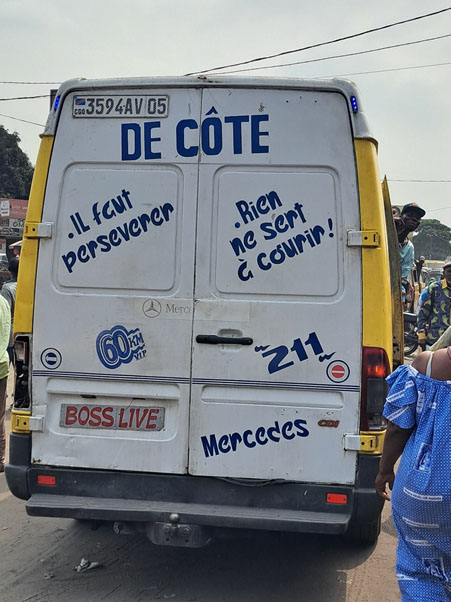 » Il faut persévérer. Rien ne sert à courir « . Si les deux phrases trouvées l’une et l’autre des deux parties de la portière arrière de ce bus 211 peuvent former un seul message, on dira que, lorsqu’on entreprend quelque projet, il est important de persévérer en allant lentement, petit à petit ; l’essentiel étant d’atteindre le but.