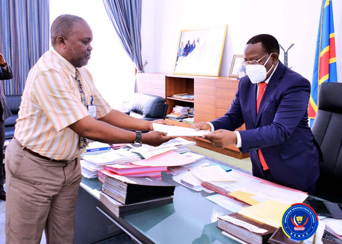 Jean-Bosco Puna remet un mémo des enseignants à Modeste Bahati