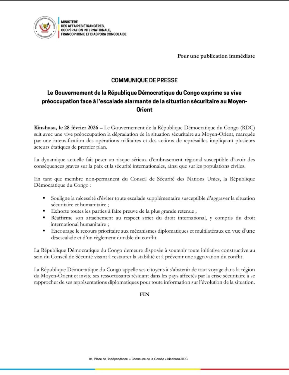 Membre non permanent du Conseil de sécurité de l’Onu, la RDC exhorte toutes les parties à la retenue, réaffirme son attachement au droit international et encourage le recours aux mécanismes diplomatiques et multilatéraux pour désamorcer le conflit. Kinshasa se dit prête à soutenir toute initiative visant à restaurer la stabilité régionale. Dans ce contexte, les ressortissants congolais sont invités à éviter toute présence dans les zones affectées et à se rapprocher des représentations diplomatiques pour suivre l’évolution de la situation.