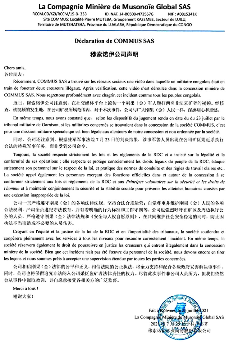 La Compagnie Minière de Musonoïe rétablit les faits