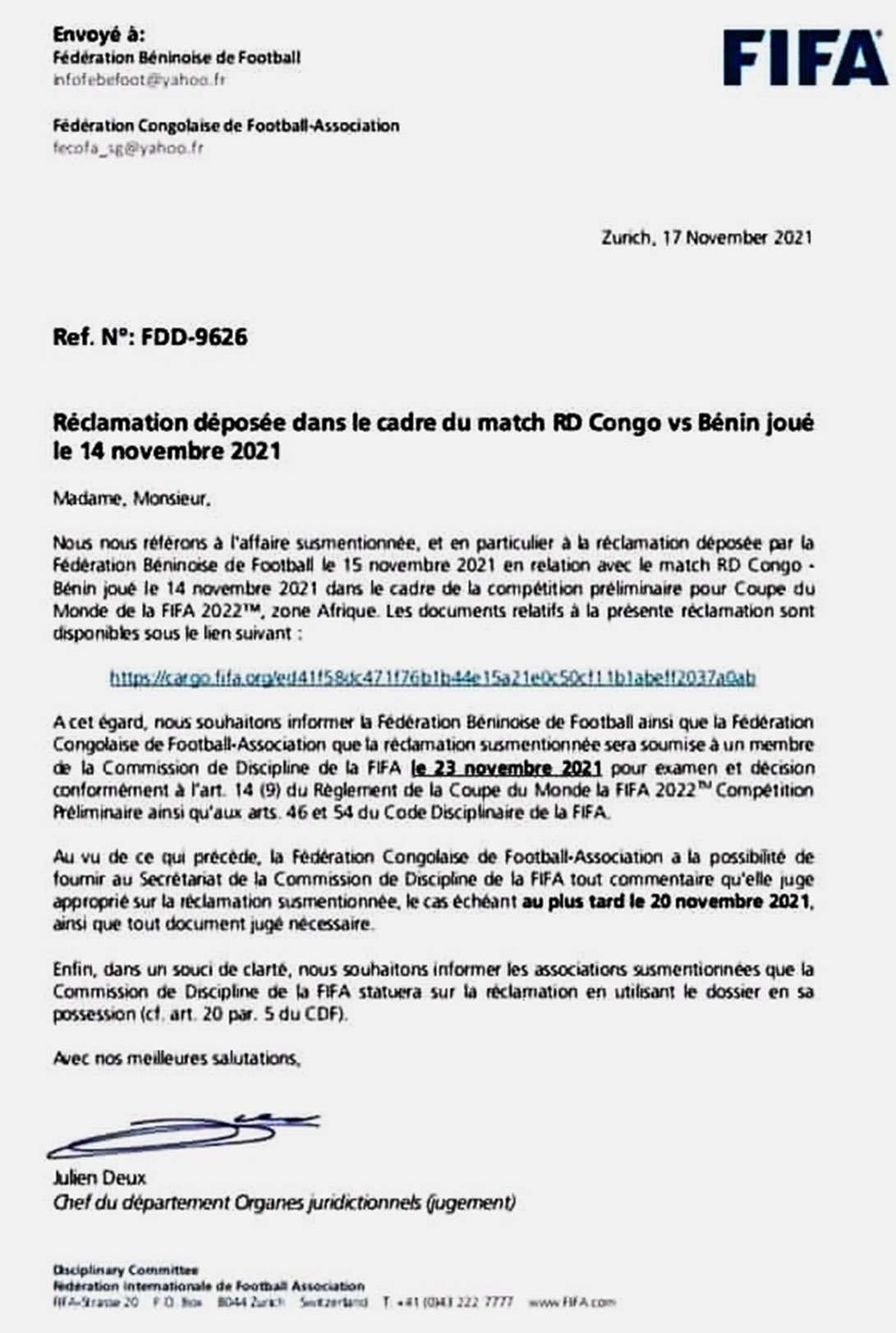 La Fédération internationale de football association ( FIFA) va rendre son verdict le jeudi 23 novembre sur la vive polémique concernant les 5 changements effectués en 4 sessions par la RDC en match de la 6è et dernière journée des éliminatoires de la Coupe du monde Qatar 2022, conformément à l’article 14 (9) du Règlement de la Coupe du monde FIFA 2022 ainsi qu’aux articles 46 et 57 du Code disciplinaire . La Fédération congolaise de football association (FECOFA) doit apporter ses éléments de défense au plus tard le 20 novembre soit trois jours avant la décision finale. Ce, après une réclamation introduite par l’organe faitier du football béninois, le lundi 15 novembre au lendemain de la défaite 2-0 à Kinshasa. Une correspondance de l’instance internationale a été envoyée aux deux fédérations, hier mercredi 17 novembre.