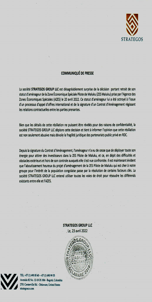En réponse au communiqué de presse diffusé vendredi 22 Avril 2022 , dans lequel l’Agence des Zones Économiques Spéciales (AZES) dans lequel annonce le retrait unilatéral de la gestion de la Zone Economique Spéciale ( ZES) de Maluku à son Aménageur, Strategos Group LLC publie ce communiqué afin de faire connaître sa position et exprimer sa surprise face à cette décision.