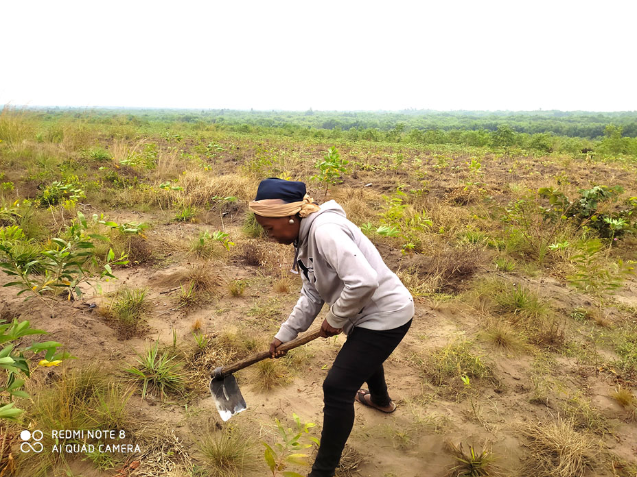 Il est 6h du matin, lorsque Bernadette Lumingu, la cinquantaine révolue, houe à l’épaule, se rend à sa ferme de 17 ha. Accompagnée de sa fille, elle s’attèle aux travaux de sarclage. Elle pratique l’agroforesterie dans le domaine de Ntsio, à 200 km du centre-ville de Kinshasa.
