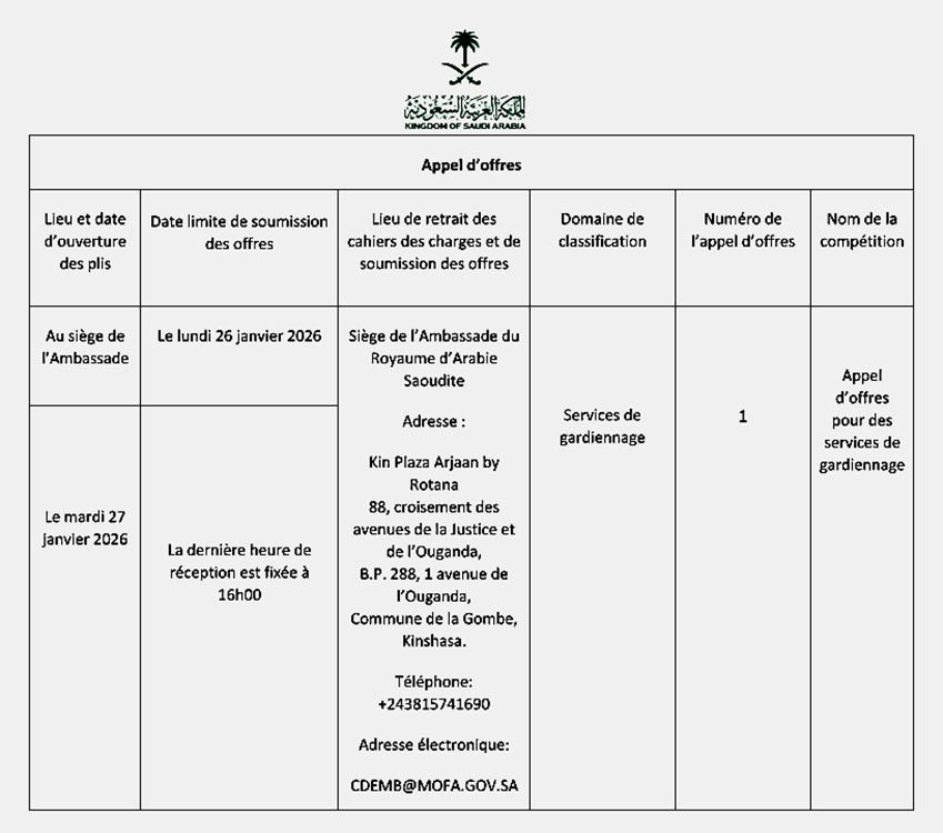 L'ambassade d'Arabie Saoudite en RDC lance un Avis d'appel d'offres pour des services de gardiennage
