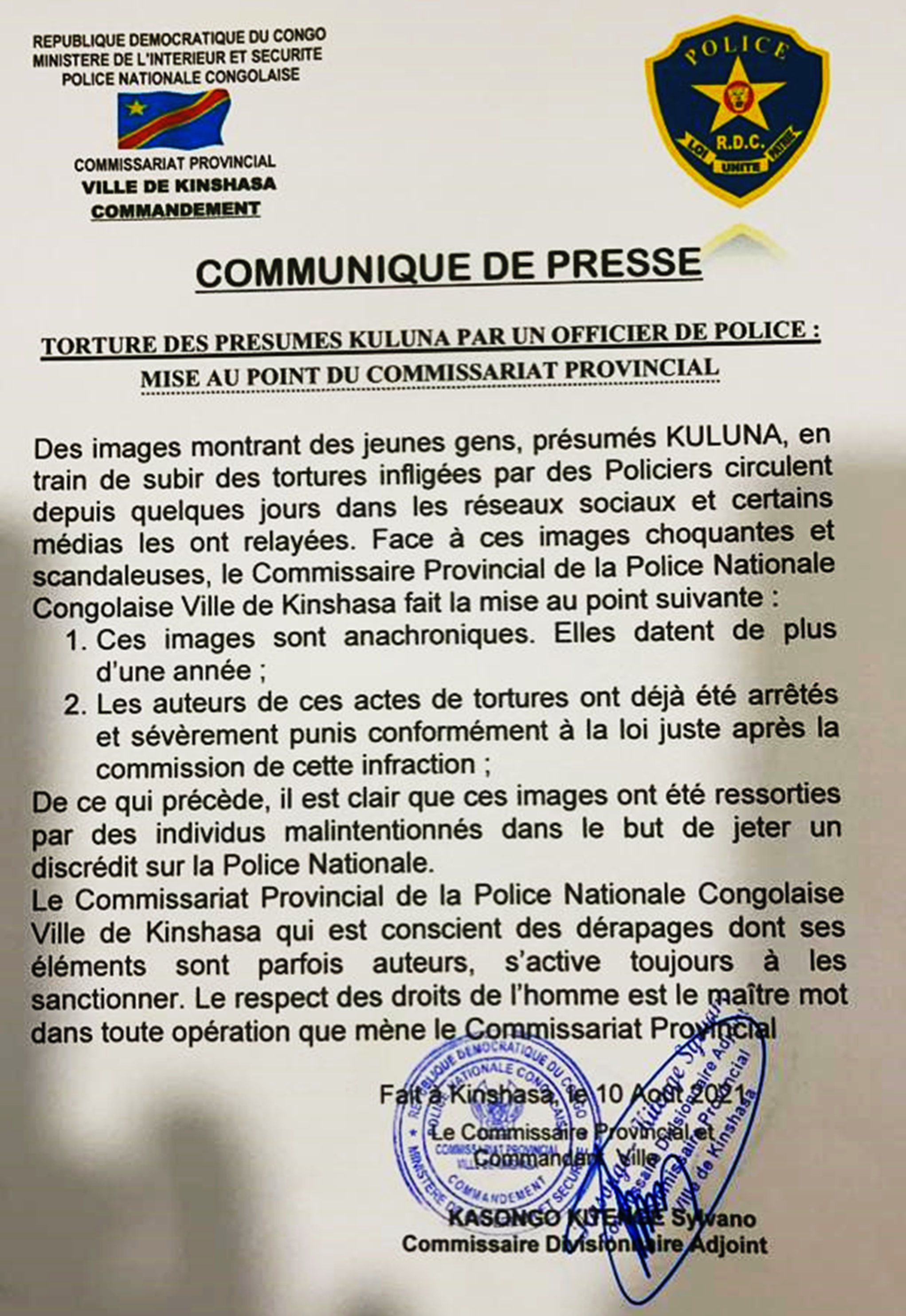 Dans un communiqué de presse ayant force de mise au point, datée d’hier mardi 10 août, le Commissaire provincial de la Police nationale congolaise ville de Kinshasa, le Général Sylvano Kasongo fait remarquer que les images montrant des présumés Kuluna en train de subir des tortures de la part des éléments de la Police datent de plus d’une année. Ci-dessous, ledit communiqué.