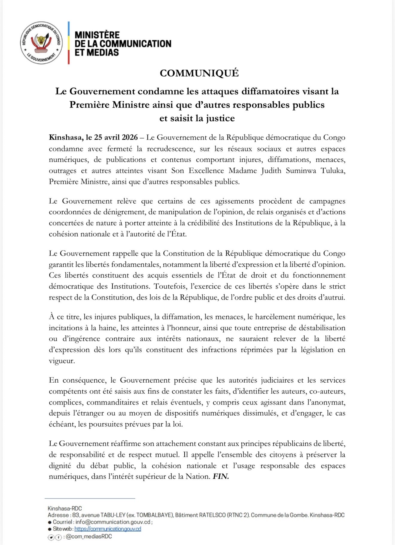 À travers un communiqué officiel publié le 25 avril, le ministère de la Communication et Médias annonce que le gouvernement de la République démocratique du Congo hausse le ton face à la montée des contenus jugés diffamatoires sur les réseaux sociaux, visant notamment la Première ministre Judith Suminwa et d'autres responsables publics.