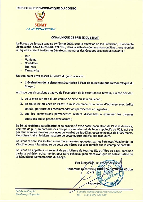Alors que la situation sécuritaire dans l'Est de la République démocratique du Congo ne cesse de se dégrader, le Bureau du Sénat, sous la présidence de Jean-Michel Sama Lukonde, a réuni, hier mercredi 19 février, les Sénateurs des groupes provinciaux de l'Ituri, du Maniema, du Nord-Kivu, du Sud-Kivu et du Tanganyika. Cette rencontre, d'une importance capitale, visait à dresser un état des lieux précis de la crise et à identifier des mesures concrètes pour y remédier.