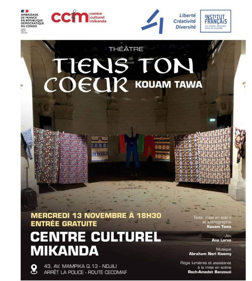 Le Centre culturel Mikanda sera le théâtre d’un événement marquant le mercredi 13 novembre à 18h30. La pièce «Tiens ton cœur», écrite et mise en scène par Kouam Tawa, promet d’apporter une touche poignante à la scène théâtrale de Kinshasa.