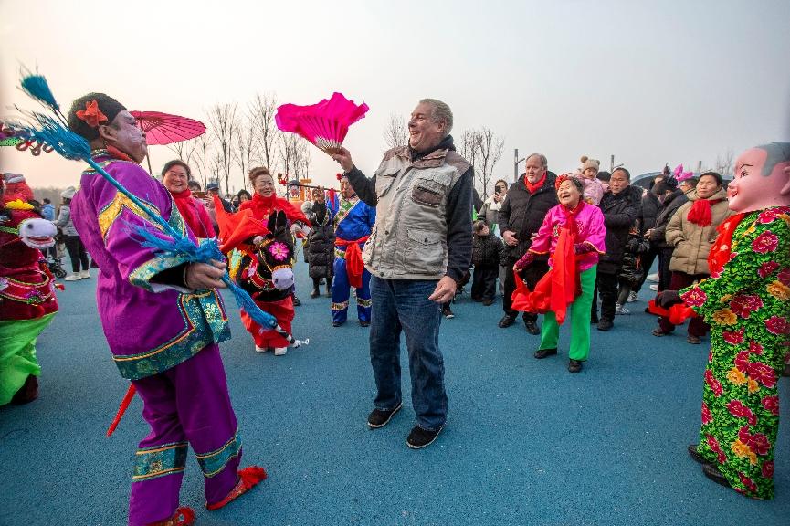 Des visiteurs étrangers et des habitants locaux se sont réunis pour chanter des chants traditionnels et exécuter une danse de l’éventail dans le parc des expositions de la ville de Handan, dans la province du Hebei (nord de la Chine), le 2 février 2025. (Nie Changqing / Pic.people.com.cn)