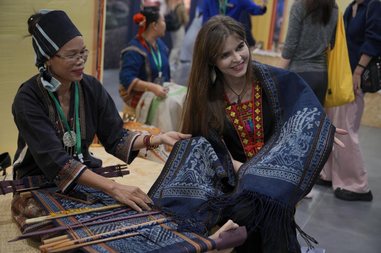Le 8 novembre 2024, la Semaine culturelle mondiale de la broderie Hainan 2024 (4e édition) a eu lieu au centre d'exposition de la province de Hainan (sud de la Chine), où des visiteurs russes ont admiré l’art de la tapisserie de la minorité ethnique Li de Hainan. (Zhang Mao / Pic.people.com.cn)