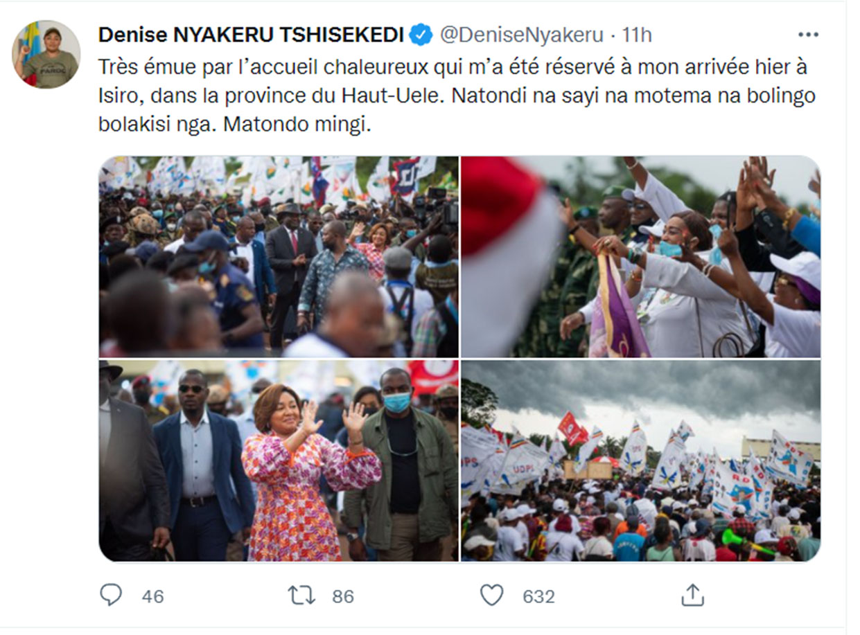 En tournée dans l’ex Province Orientale, la Première dame de la RD Congo a séjourné pendant 48 heures à Bunia chef-lieu de la province de l’Ituri pour communier avec la population, pour la plupart victime des affres de la guerre interethnique, fait remarquer un communiqué de presse du bureau du conjoint du Chef de l’Etat.