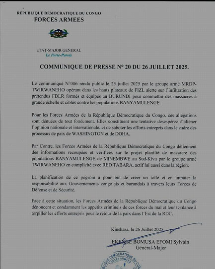 Dans le même communiqué, l'armée congolaise affirme disposer d'informations fiables sur un plan criminel en préparation par le groupe Twirwaneho, avec la complicité du groupe RED TABARA. Ce complot viserait à attaquer les Banyamulenge dans la région de Minembwe, au Sud-Kivu, assure le général-major Sylvain Ekenge.