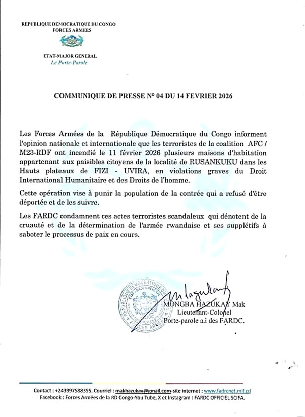 "Les forces armées de la République démocratique du Congo informent l'opinion nationale et internationale que les terroristes de la coalition AFC-M23/RDF ont incendié le 11 février 2026 plusieurs maisons d'habitation des paisibles citoyens de la localité de Rusankuku dans les hauts plateaux de Fizi", peut-on lire dans ce communiqué.