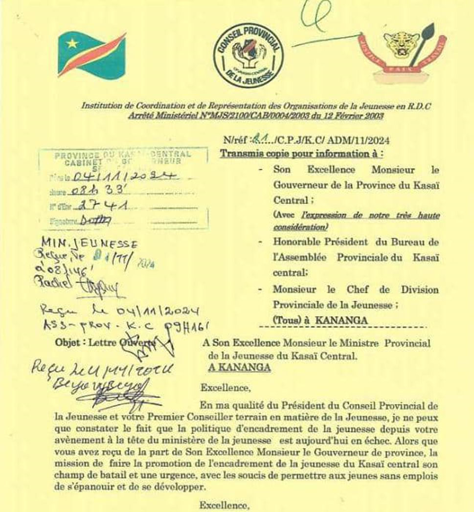 Par le biais du Président du Conseil provincial de la jeunesse (CPJ Kasaï-Central), Peter Bakandowa Tshitumbu, les jeunes s’interrogent sur le rôle que joueraient l’ancien ministre de l’Agriculture et sa bande à la tête du ministère de la jeunesse pour lequel il n’a mené aucune action voire une réunion avec ses administrés.