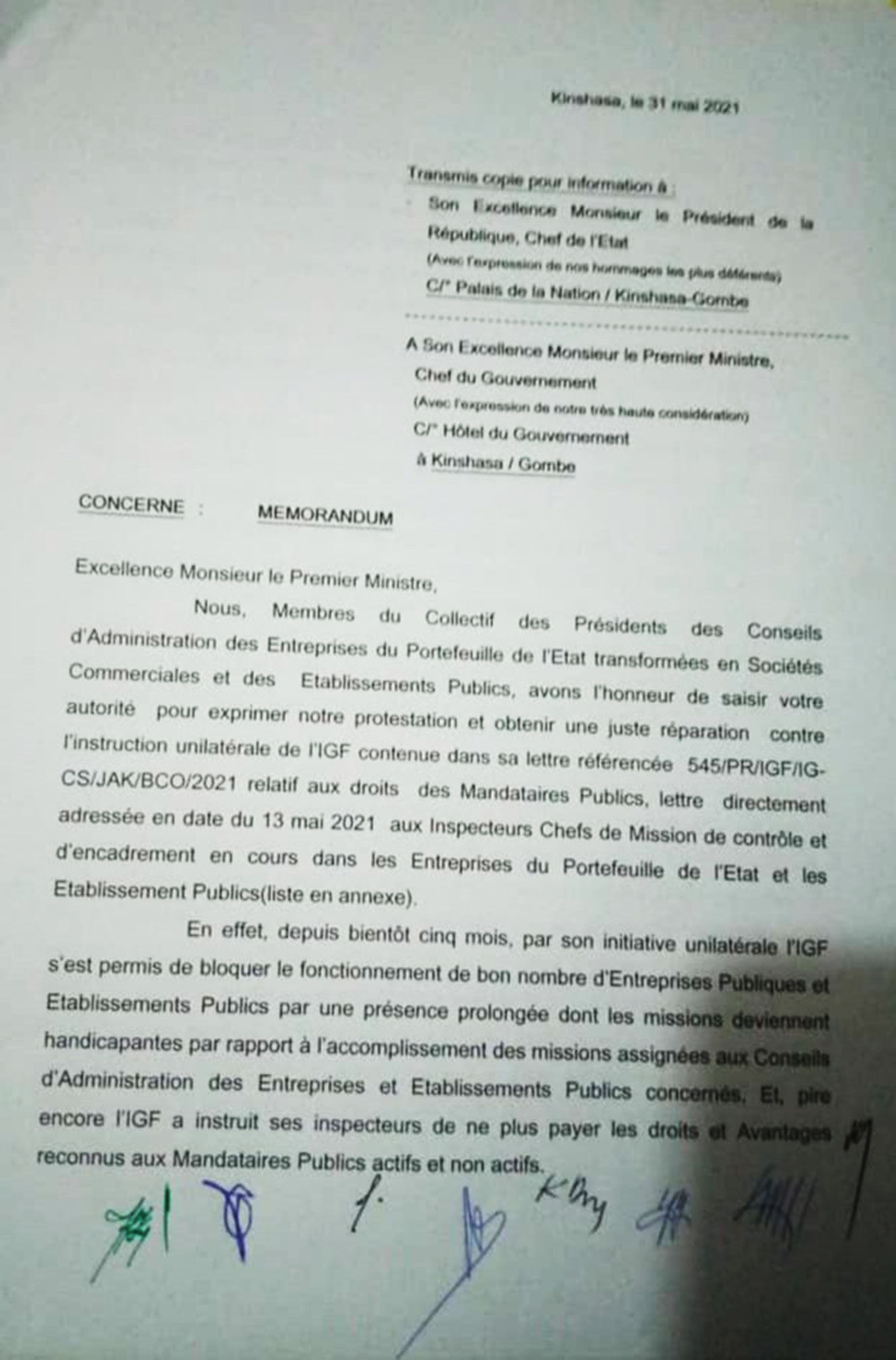 Et de poursuivre : « à cause de ses instructions unilatérales, L’IGF a créé un dysfonctionnement au sein des entreprises publiques du portefeuille de l’Etat et établissements publics avec toutes les conséquences qui peuvent en découler « . En outre, ce collectif de PCA des entreprises publiques accuse l’inspection générale des finances d’avoir bafoué les traités internationaux que la RDC a ratifiés en matière de gestion et d’administration d’entreprises dans le cadre de l’OHADA.